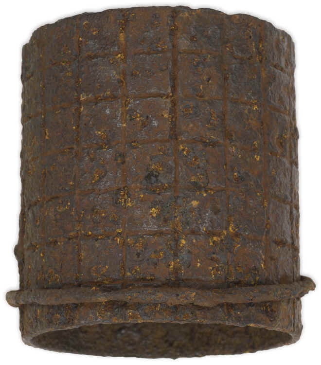 PHYSICAL DESCRIPTION: Second pattern, tooled steel construction, grenade fragmentation sleeve with a serrated outer surface. Example shows rusting/pitting and is a dug example.