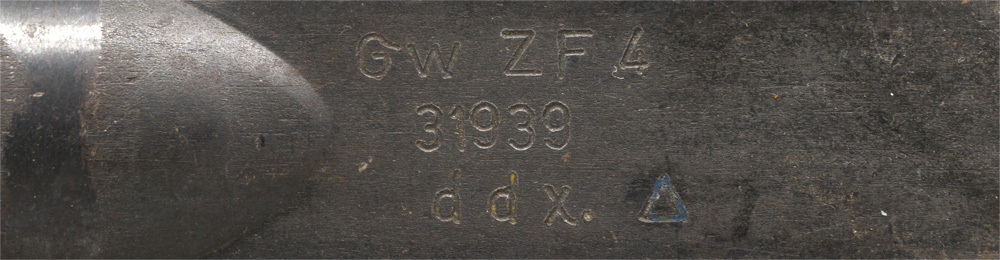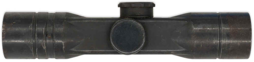 PHYSICAL DESCRIPTION: Four power magnification, blued, tooled steel, scope with milled range elevation adjustment dial. Range adjustment varies from 100 to 800 metres in increments of 50 metres. Windage adjustment is set internally. Scope only retains remnants of its original bluing. Optics are quite clean, with the single vertical and dual horizontal side bar reticle pattern sights. Elevation adjustment dial raises or lowers the reticle sights as required. Scope well marked with impressed designation, "Gw ZF 4", indicating Gewehr -Zielfernrohr 4-fach, (Rifle-Telescopic sight 4 power), manufacturers code, "ddx" indicating manufacture by Voigtländer & Sohn A.-G Braunschweig, a triangular lubricant code, signifying temperature ranges the scope could be used in, and serial number, "31939".
