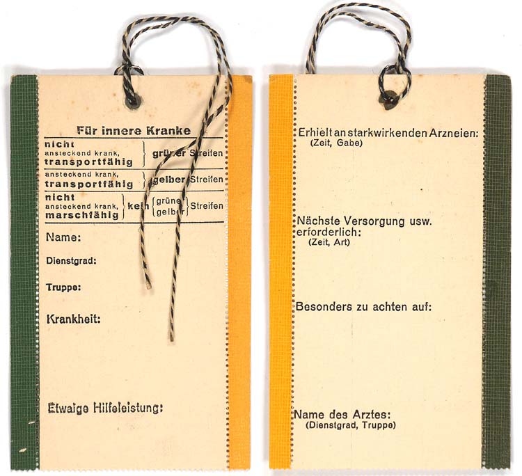 Each Division in the German Army of WWII had Divisional Support units which included a medical unit that normally consisted of two companies, a mobile field hospital and two ambulance platoons. Within these medical units EM’s and Junior NCO’s with basic medical training acted as medical orderlies or stretcher bearers under the command of doctors with Officers ranks. The German army also maintained static hospitals in the rear areas for those with more severe wounds and those with the most serious injuries that would require long rehabilitation times would be sent to a hospital in their home military recruiting district within Germany. Generally the German field units preferred to care for their own wounded as much as possible as a convalescents transferred to a rear area static military or home military district hospital could potentially be dispatched to a new unit on their recovery. As a result most of the Divisional medical support units maintained a generous supply of medical equipment and accessories to provide the most favourable "in-house" care as possible. Among the medical equipment and accessories were a wide variety of bandages, wound dressings, basic first-aid items and wound tags. The wound tags were issued to medical personnel in booklets containing twenty-five tags and were attached to wounded personnel to indicate their wound and the appropriate action to be taken. Regulations dictated that the wound tags were only to be filled in by a doctor and that the tag was to be attach to the second button hole of the tunic, coat or the shirt button hole of the wounded individual.PHYSICAL DESCRIPTION: Unissued, 8cm x 13cm, paper tag with perforated pull off sides. Original string is still attached. Scarce.