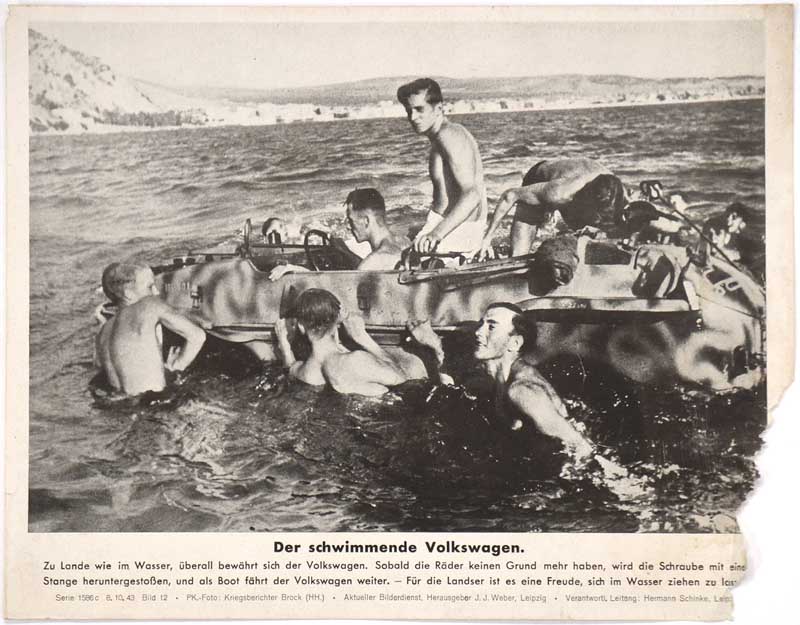 A 23.5cm x 18cm black and white photograph that has a printed caption "Der Schwimmende Volkswagen" or "The Floating Volkswagen." A section of the bottom right as been torn away.