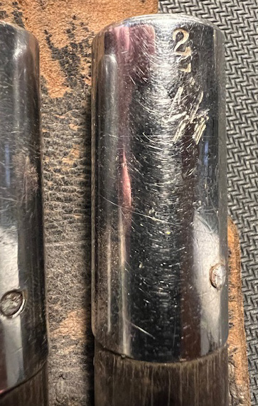 A pair of wooden sticks measuring approximately 42cm long with silver ends that have hollowed, triangular shape that fit on the spanner bolts of the drum for tuning. The capped ends are a bit loose against the wooden stick. Included is a leather