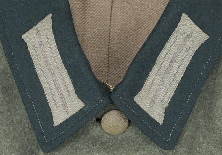 BACKGROUND: The M40 field blouse was basically a continuation of the modifications of the M33 field blouse which had evolved into the M36 field blouse. Modifications to the M36 field blouse included alteration of the bright silver/aluminum NCO tress and rank chevrons to a less visible subdued matte grey tress in April 1940, and changing the blue/green badge cloth collar to a field grey basic cloth collar in May 1940. These alterations resulted in the M40 field blouse. Of Note: Although the bright silver/aluminum NCO tress and rank chevrons were to be replaced with the less visible subdued matte grey tress, it is not uncommon to find the brighter tress still in use on the M40 or even later produced field blouses. Officers and certain senior NCO ranks were responsible for purchasing their own uniforms and as a result were allotted a clothing allowance through the army’s Kliederkasse, (Clothing Account), system. The Officers and certain senior NCO’s could choose to purchase their uniforms from the armed forces clothing depots or to privately purchase garments of higher quality. Although enlisted personnel were issued their uniforms from government supplies they were also permitted to purchase privately tailored uniforms although the price may have been restrictive.