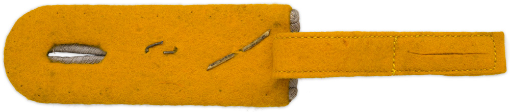 PHYSICAL DESCRIPTION: Slip on shoulder board of matte silver/aluminum Russian braid with single gilt washed rank pip and unit number “7” mounted on a golden yellow wool waffenfarbe base.