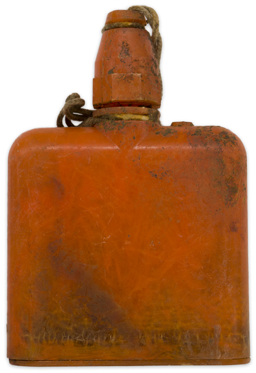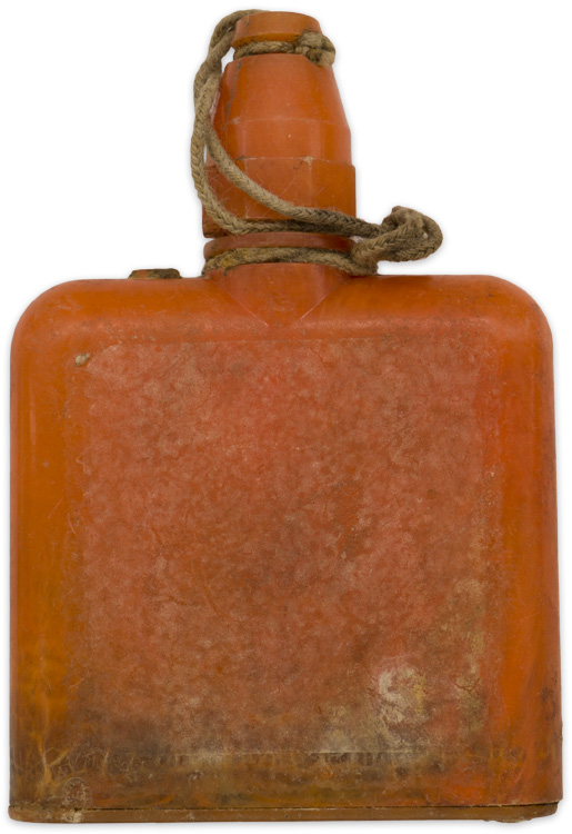 PHYSICAL DESCRIPTION: Roughly, 10cm tall, 6.5cm wide and 2cm thick, molded orange bakelite construction, flask like, container with an extended, 3cm tall, pointed tip spout with a screw cap closure to the top edge. The bottom edge of the container is well marked with embossed script, "Hautentgiftungsalbe", (Skin Decontamination Ointment), the manufacturers three letter code and date, "eje" "1943".