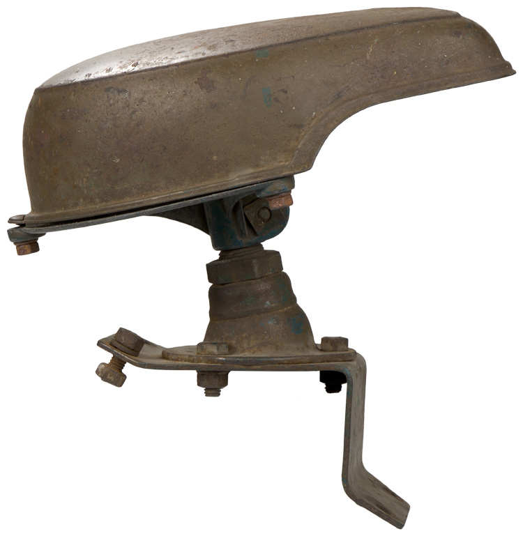 As a security precaution, laws were imposed that all vehicles, both military and civilian, were required to mask their headlights when night driving was permitted. This was accomplished by a wide variety of expedient measures on civilian vehicles and the more permanent measure of a factory manufactured black out light, on most military vehicles. Tooled sheet metal and steel construction, vehicular "Notek" black out light. Light consists of a slightly convexed top, oval shaped hood with a flat forward edge. The top front of the hood has an embossed manufactures logo and name, "Notek". Decent example.