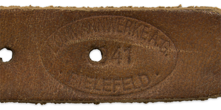 PHYSICAL DESCRIPTION: Two piece leather construction helmet chinstrap with steel fittings. Both sections and studs all complete. Maker marked for 1941. Nice 13 hole original.
