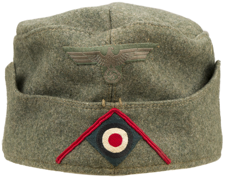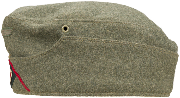 PHYSICAL DESCRIPTION: Field-grey, wool/rayon blend construction cap with fold down side and back panels with gently sloping, downward scallops to the front and forward sides. As is typical the fold down panels are handstitched in the upright position at the front center of the cap. The cap has a field-grey enamel painted, metal alloy, ventilation grommet to either side, positioned just below the crown edge. The front center of the cap has a machine woven, national eagle in pale, mouse grey, threads on a cut-out, woven, field-grey rayon base. The eagle is neatly handstitched to the cap. The front center of the fold down panels has a machine woven, national tri-color cockade, on a woven, diamond shaped, blue/green rayon base. The cockade is machine stitched to the cap. The cap has a bright red rayon, inverted, "V", soutache flanking the cockade indicating service with the Artillery. The soutache has been applied in the correct manner, being machine stitched in place and inserted through two, small, puncture holes near the bottom edge of the cap. The interior of the cap is fully lined in ribbed, grey cotton/rayon blend material. Superb, size, maker and depot markings. One of the nicest we have had!