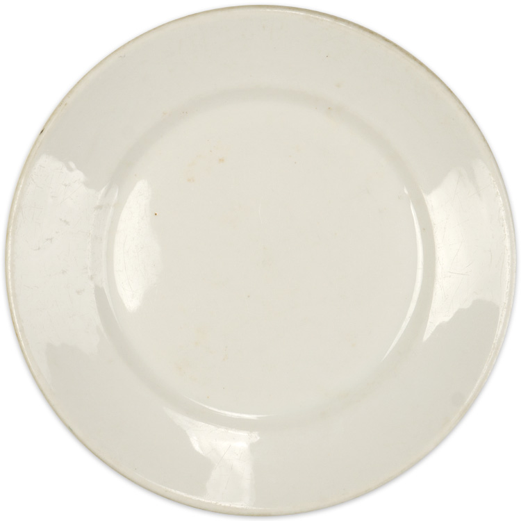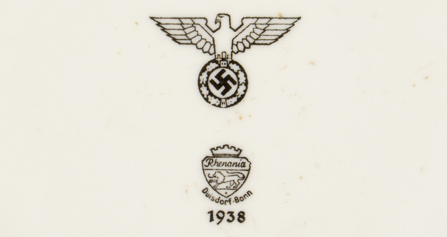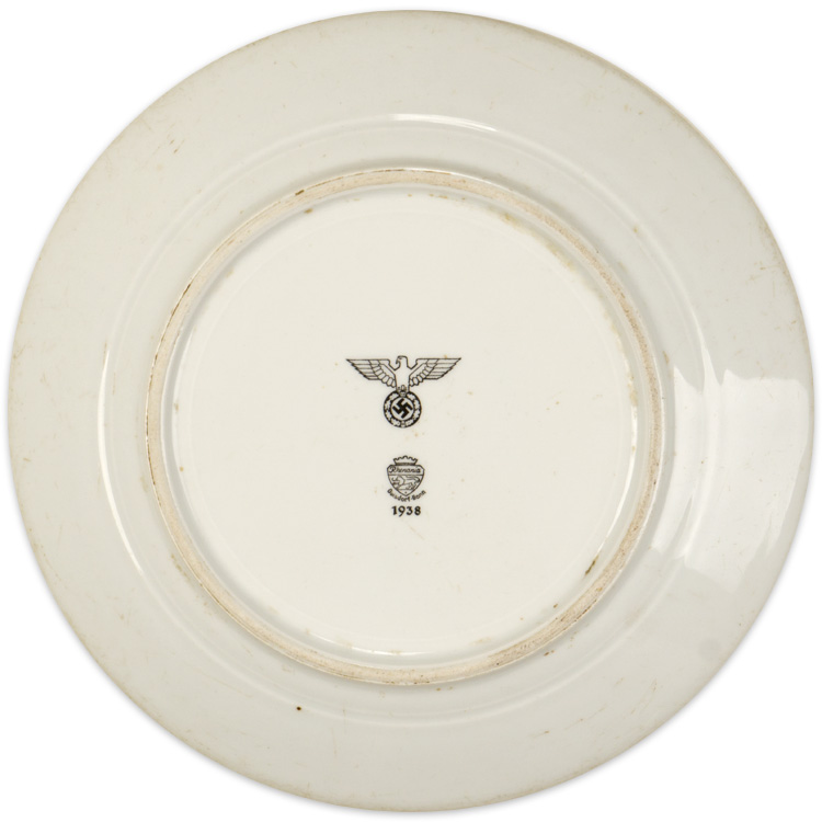 PHYSICAL DESCRIPTION: A white, glazed stoneware dinner plate that measures approximately 23cm in diameter with a recessed center. To the raised bottom, painted under the glaze is a German eagle along with the manufacture name, logo and a 1938 date. The plate shows light usage and wear.