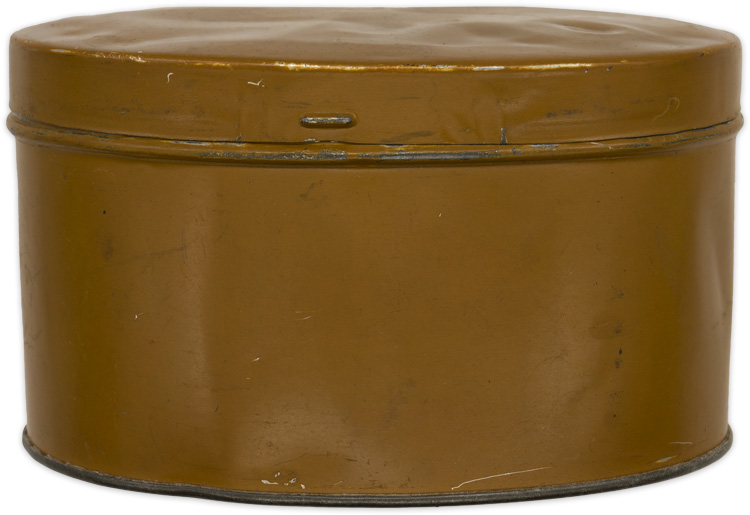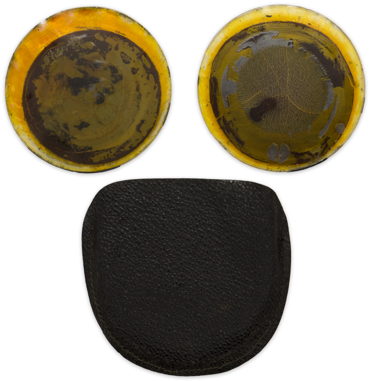 PHYSICAL DESCRIPTION: General purpose goggles with a cut-out, leather frame with stitched on, circular metal alloy lens retainers. Each amber lense has five ventilation holes to the bottom. Comes with original case and a small leather pouch with additional lenses. The container has some denting and is a bit misshapen which causes the top to go on with a bit of difficulty.