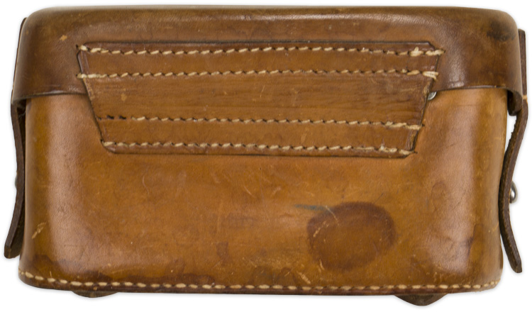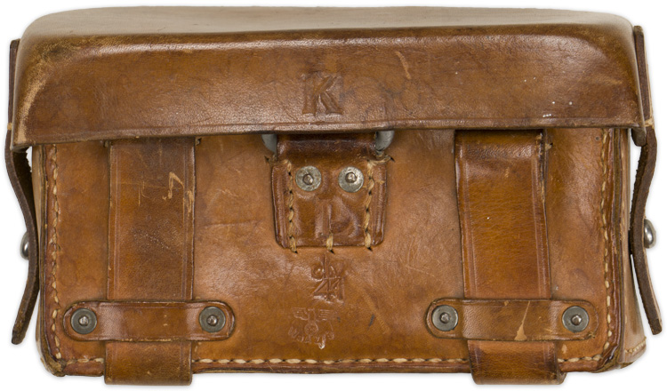 PHYSICAL DESCRIPTION: Thick, molded, light tan leather construction medical pouch for unmounted personnel with a slightly curved reverse, machine stitched seams and steel fittings. The top of the pouch has a fold back lid with a machine stitched, horizontal, leather hinge to the obverse and a vertical leather closure strap, with a single cut-out eyelet, to each side which attached to extended steel studs positioned on each side of the pouch’s body. The reverse of the pouch has two, stitched on, vertical, leather belt loops with stitched on, horizontal, retaining loops. The belt loops also have a single cut-out eyelet and attached to steel studs positioned on the bottom edge of the pouch’s body. The reverse of the pouch also has a central, stitched, leather retainer securing a steel "D" ring. The reverse of the pouch is well marked with "K", indicating, Kragenträger, (Stretcher bearer), and a waffen-amt. Maker marked and dated for 1941.
