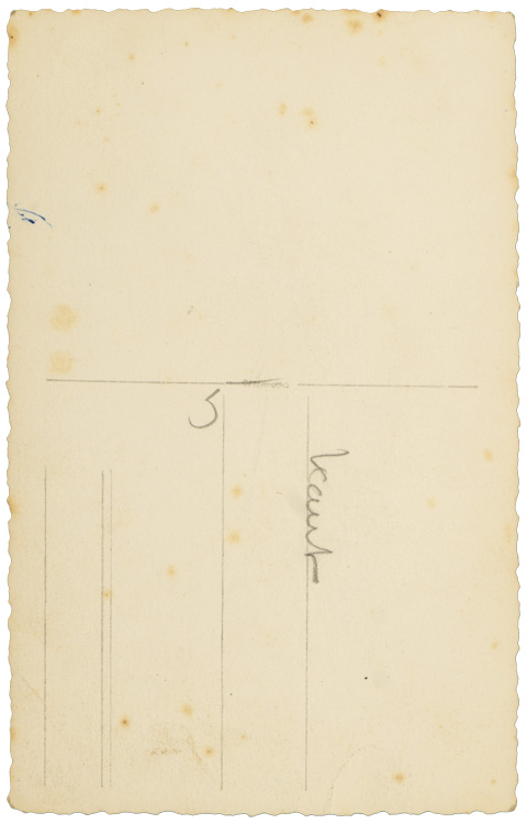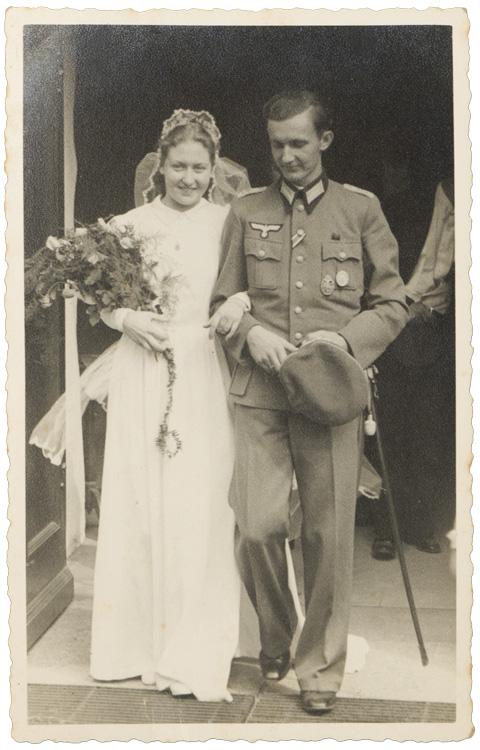 PHYSICAL DESCRIPTION: Roughly, 5 3/8" x 3 3/8" mid-weight, card stock, postcard features a full length, black and white photograph of a young, uniformed Officer carrying a visor cap, arm in arm with his new bride. The Officer’s visible uniform details include, shoulder boards and collar tabs, a breast eagle, an Iron Cross 2ND class ribbon, a single place ribbon bar, a Panzer Assault Badge, what appears to be a silver Wound Badge and a sword with portepee. The reverse of the postcard has a single handwritten word that may be the name, "Karl".? The unused postcard is in overall very good condition with minor age yellowing.