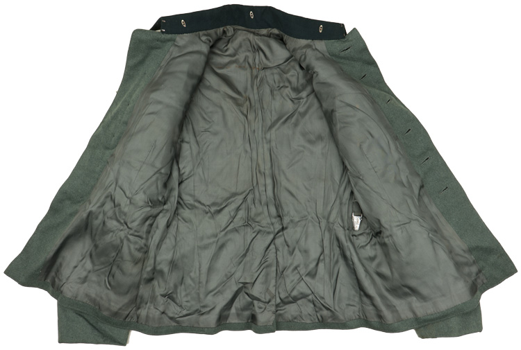 PHYSICAL DESCRIPTION: Nice quality, private purchase, field-grey wool/rayon blend construction tunic. The tunic features a vertical, six button front closure with dual metal hooks and eyes at the neck. The tunic has four, pleated, front pockets with scalloped button down flaps. The right breast has a hand embroidered breast eagle in bright silver/aluminum wire and bullion threads with green accent threads, on a cut-out, dark blue/green badge cloth base. The eagle is neatly handstitched to tunic. The straight cut, non-adjustable sleeves have deep, turned up French cuffs which are tacked into the upright position. The reverse of the tunic has a central, vertical tail skirt vent. Nice quality, black, doeskin, wool construction cufftitle features hand embroidered Sütterlin style script, "Großdeutschland", in bright, silver/aluminum wire threads. The cufftitle is bordered at both the top and bottom edges in horizontal, bright, silver/aluminum Russian braid. The tunic has sewn on shoulder boards of matte silver/aluminum Russian braid with a single stamped, gilt washed, alloy rank pip and "GD" cyphers to each. The tunic has a lay down, blue/green badge cloth collar with the typical zig-zag reinforcement stitching to the reverse. The collar features hand embroidered collar tabs in matte silver/aluminum wire threads with twisted white rayon branch of service stripes. The collar tabs are mounted on blue/green badge cloth bases which show through as the center stripe. The collar tabs are neatly handstitched to the collar. The interior of the tunic is fully lined in grey/green rayon with off-white striped sleeves. The buttons are all the field-grey painted, pebbled, magnetic sheet metal type and appear to have their original stitching. Shows the expected period use and wear but overall nice condition. Few tiny moth nips and nap wear. The tunic is roughly a size 32" to 34" chest. All original insignia, but it has been collector added to the tunic to the tunic.