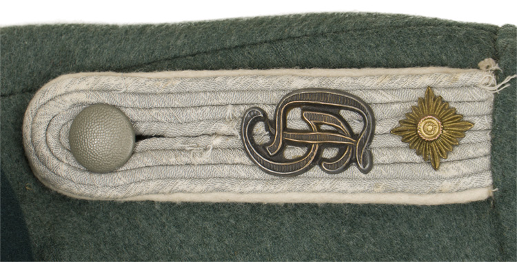 BACKGROUND: The development of the M36 field blouse can be traced back to April 1933 with the introduction of the first pattern field blouses which were a departure from the cut and style of tunics utilized in World War I. From its introduction until 1936 the field blouse underwent a couple of small modifications designed to enhance its performance, appearance and longevity. Modifications to the 1933 pattern field blouse began in December 1934 when the original field-grey basic cloth collar was altered to a field-grey badge cloth for a better appearance. In September 1935 the collar was altered again from the field-grey badge cloth to dark blue/green badge cloth. The final pre-war modification to the field blouse occurred in December 1936 with the addition of a partial lining to the interior breast and upper back panels to increase its wear-out time. Officers and certain senior NCO ranks were responsible for purchasing their own uniforms and as a result were allotted a clothing allowance through the army’s Kleiderkasse, (Clothing Account), system. The Officers and certain senior NCO’s could choose to purchase their uniforms from the armed forces clothing depots or to privately purchase garments of higher quality. Although enlisted personnel were issued their uniforms from government supplies they were also permitted to purchase privately tailored uniforms although the price may have been restrictive. On the field blouse and service tunic the waffenfarbe was generally displayed on the shoulder straps/boards and the collar tabs. Of Note: The origins of the elite Panzer Division Großdeutschland may be traced back to the formation of the Wachregiment Berlin, (Guard Regiment Berlin), in 1921. The Wachregiment was tasked with guarding all the military installations within greater Berlin as well as providing security for State visit and formal functions but was soon disbanded after its formation as it was considered unpredictable and was reformed as Kommando der Wachtruppe, (Commanding Guard Troops). In the autumn of 1934 the Kommando der Wachtruppe was re-designated Wachtruppe Berlin and in June 1937 the Wachtruppe Berlin, (Guard Troops Berlin), was enlarged and re-designated, Wachregiment Berlin. On June 12TH 1939 the Wachregiment, was given Infantry regiment status and renamed Großdeutschland Infantry Regiment with its personnel eventually going on to form the cadre of the elite Panzer Division Großdeutschland in May 1942. On June 20TH 1939 special uniforms and insignia were introduced for all Großdeutschland personnel including the distinctive cufftitle and shoulder board/strap cyphers. Although the unique "GD" uniforms were placed in storage until altered and reissued in 1944, personnel of the regiment did utilize the shoulder board/strap cyphers and the distinctive cufftitle through-out the war.