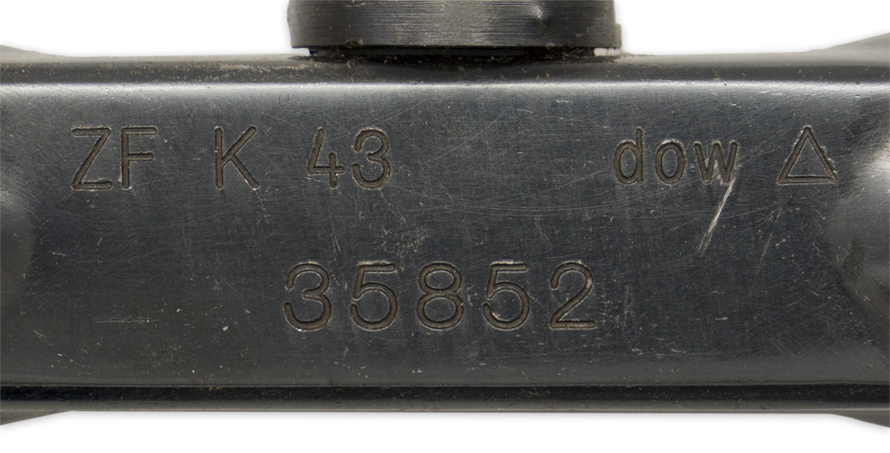 PHYSICAL DESCRIPTION: Four power magnification, blued, machine tooled steel construction scope. The centerpiece features a raised, milled, range elevation adjustment dial with variable range adjustments from 100 to 800 meters in increments of 100 meters. The centerpiece also has a raised windage adjustment dial that is internally set. The optics with the typical single vertical and dual horizontal side bar reticle pattern sights. The range elevation adjustment dial raises or lowers the reticle pattern as required. The scope is well marked with the impressed designation abbreviation, "ZF K 43", indicating, Zielfernrohr für Karabiner, (Telescopic sight for Carbine 43), the manufacturers code, "dow", indicating manufacture by Opticotechna G.m.b.H. of Prerau Czechoslovakia, a triangular lubricant code, signifying a lubricant that was effective to temperatures of +122 to -40 degrees Fahrenheit and the serial number, "35852".