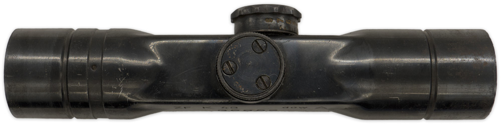 BACKGROUND: Although development of a Selbstladegewehr, (Semiautomatic rifle), had been undertaken by German armament factories as early as 1908, it wasn’t until the invasion of Russia in 1941, when the Germans came up against Russians armed with the quick firing Tokarev semiautomatic rifles that the Heeresfeldzeugmeisterei, (Army Ordnance Department), issued an urgent request for a comparable weapon. This led to the development of the Selbstladegewehr 41 in 1941 which, with modifications, evolved into the Gewehr 43 and eventually the Karabiner 43in 1943. The Gewehr 43 and Karabiner 43 were basically improved modification of the Selbstladegewehr 41, and were designed with an integral "T" shaped scope mounting base. This design allowed the rifle to be converted to a sharpshooters rifle with the ease of sliding on a preassembled, mass produced scope assembly. The four power magnification ZFK 43, also referred to as the Gw ZF4 sharpshooter’s scope was developed in late 1943 by the Voigtländer optical firm and was designed for use with the Gewehr 43 and Karabiner 43 semi-automatic rifles.