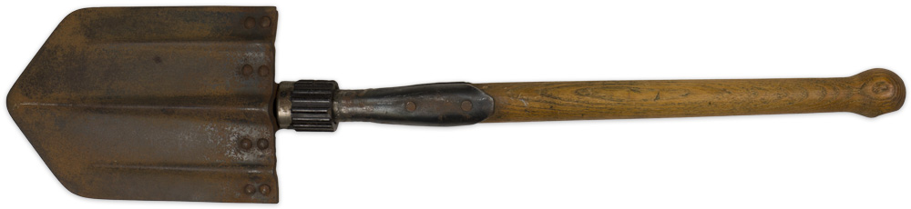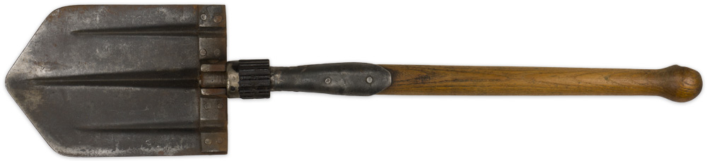 PHYSICAL DESCRIPTION: The folding shovel consists of a lathed hardwood construction handle with an enlarged ball head for ease of handling and a slightly curved, pointed tip, tooled steel construction shovel head. The shovel head has three, evenly spaced, embossed, reinforcement ribs and is affixed to a hinged bar by eight, small, dome headed rivets. The hinged bar is secured to an internal steel retaining bar which is fitted into the wooden handle and secured by dual, extended sheet metal sleeves with two flat headed rivets. The shovel has a vertically ribbed, molded brown bakelite and steel nut with internal screw threads that allows the shovel head to be adjusted into three different positions as required. The bakelite nut still functions. The three different positions consist of the open position for use as a shovel, the 90 degree angled position for use as a pick, and the closed position for transportation and storage. The shovel head is manufacture marked.