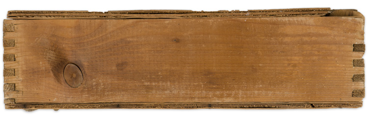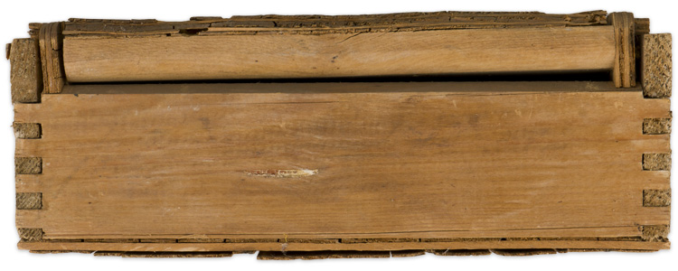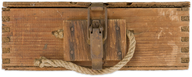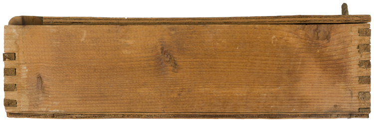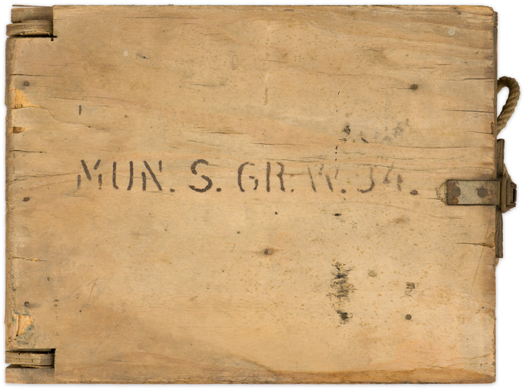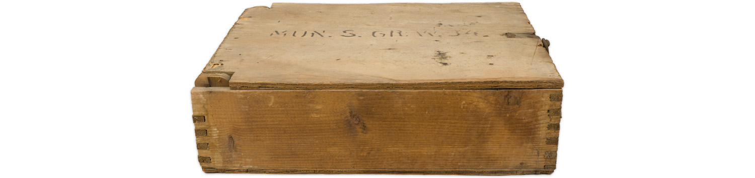 PHYSICAL DESCRIPTION: A 10cm x 28.5cm x 37cm light weight wooden case with dove tail corners, hinged lid, and spring latch. The lid is marked "MUN. S. GRW34". The carrying case is complete with rack insert. The wood shows typical usage and wear for such an item. The case was designed to contain three shells for the 8cm M34 Heavy Mortar.