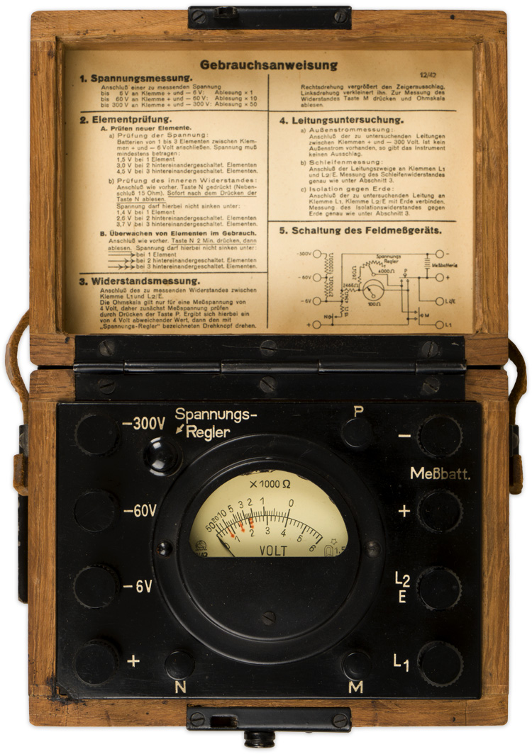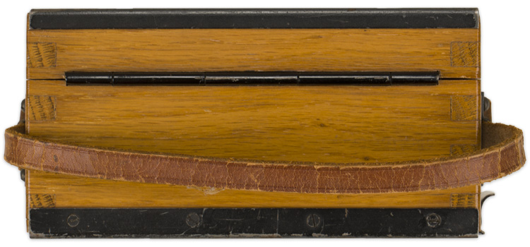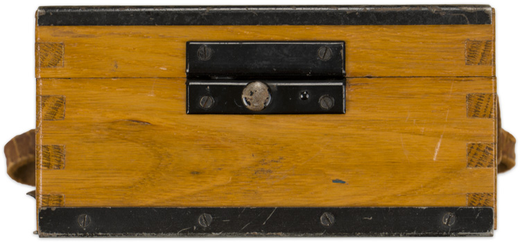 A wooden7.5cm x 11cm x 15cm wooden box with hinged lid and leather carrying handle that holds a voltage metre. The magnetic metal bottom slides out to reveal the underside of the metre. A brass plate with the manufacture name "Schoeller & Co. Frankfurt A/M.S." is visible when the bottom is moved.