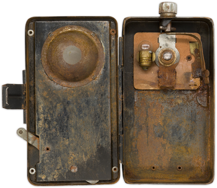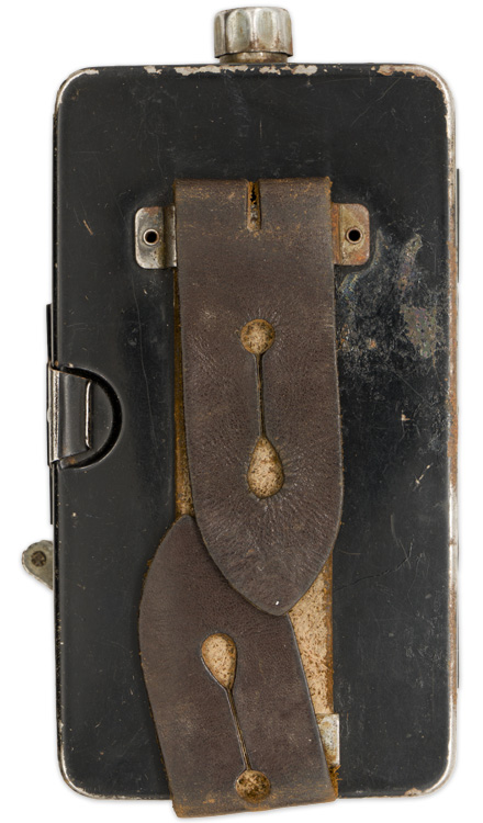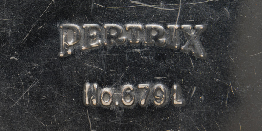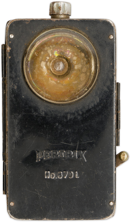PHYSICAL DESCRIPTION: Roughly, 13cm tall, 7cm wide, 3cm thick, black painted, magnetic sheet metal construction field flashlight. The obverse of the flashlight features a roughly, 5cm diameter, clear glass lens to the top edge. The obverse body of the flashlight is well marked with the embossed manufactures name and model number, "Pertrix No. 679L". The top edge of the flashlight has an extended, spring loaded, turnable on/off switch which still functions. The side panels feature a, vertical, staggered, internal bar hinge to one side and a pressure closure clip to the other side. One side of the flashlight also has an extended, swivel tab that adjusts an internal "black-out" panel with a small square cut-out that slides over the clear lens to reduce the light emission. The reverse of the flashlight has two small, raised, rivetted on horizontal metal loops which secure a dual button holed, brown leather tab designed to allow the flashlight to be attached to the uniform buttons. The interior of the flashlight still retains all of is component parts including a light bulb, but the battery is absent. Light surface rusting to the interior. The flashlight retains about 90% of its original black paint.