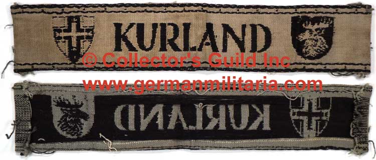 BACKGROUND: The "Kurland", (Courland), cufftitle was the fourth and final cufftitle in a series of four campaign award cufftitles, (The Kreta, Afrika and Metz cufftitles were the first three), and was introduced on March 12TH 1945, for award to personnel who were encircled and successful held back the Russians in the Courland peninsula region of Latvia. The cufftitle was considered a military combat decoration, and as such, was bestowed with a corresponding award possession document. Bestowal of the award was opened to all personnel of Army Group Courland that were besieged in the Courland pocket. Criteria for award of the cufftitle include a minimum of three months service or three battle engagements in the pocket or only one engagement if wounded during the action. Of Note: Due to the inherent problems with supplying the encircled troops the majority of the cufftitles were manufactured within the pocket at a fabric weaving mill in the city of Kuldiga and some were also allegedly handmade by civilian women within the pocket. Also Of Note: Roughly thirty-two depleted Infantry divisions, two Panzer divisions and miscellaneous Latvian units consisting of approximately 200,000 personnel were trapped in late September 1944 when the Russians broke through the south east of Latvia and Lithuania to the Baltic sea. These personnel had formed Heeresgruppe Nord which was re-designated Heeresgruppe Kurland on January 25TH 1945 under the command of Generaloberst Dr. Lothar Rendulic. Between October 15TH 1944 and May 8TH 1945 the entrapped personnel repelled six major Soviet assaults with the Soviets enjoying a manpower superiority of between 6:1/10:1. According to German sources these assaults, commonly referred to as "Grand Battles", resulted in causing the Russians over 400,000 casualties, 2,600 lost tanks and around 700 aircraft with very little to show in territorial gains. The encircled Germans held out until the end of the war and "Fortress Courland" officially surrendered at 2:00pm on May 8TH 1945.