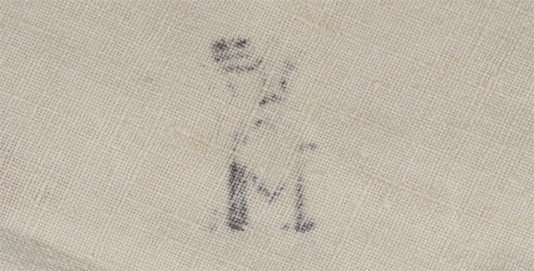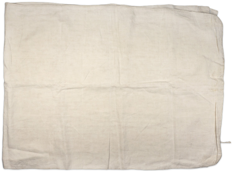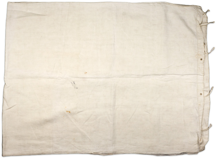 A white cotton/linen cover that is open to one end. The mattress measures approximately 72cm x 226cm. It is complete with three pair of tapes to the open end that correspond to reinforced, stitched grommet. Nicely KM marked.