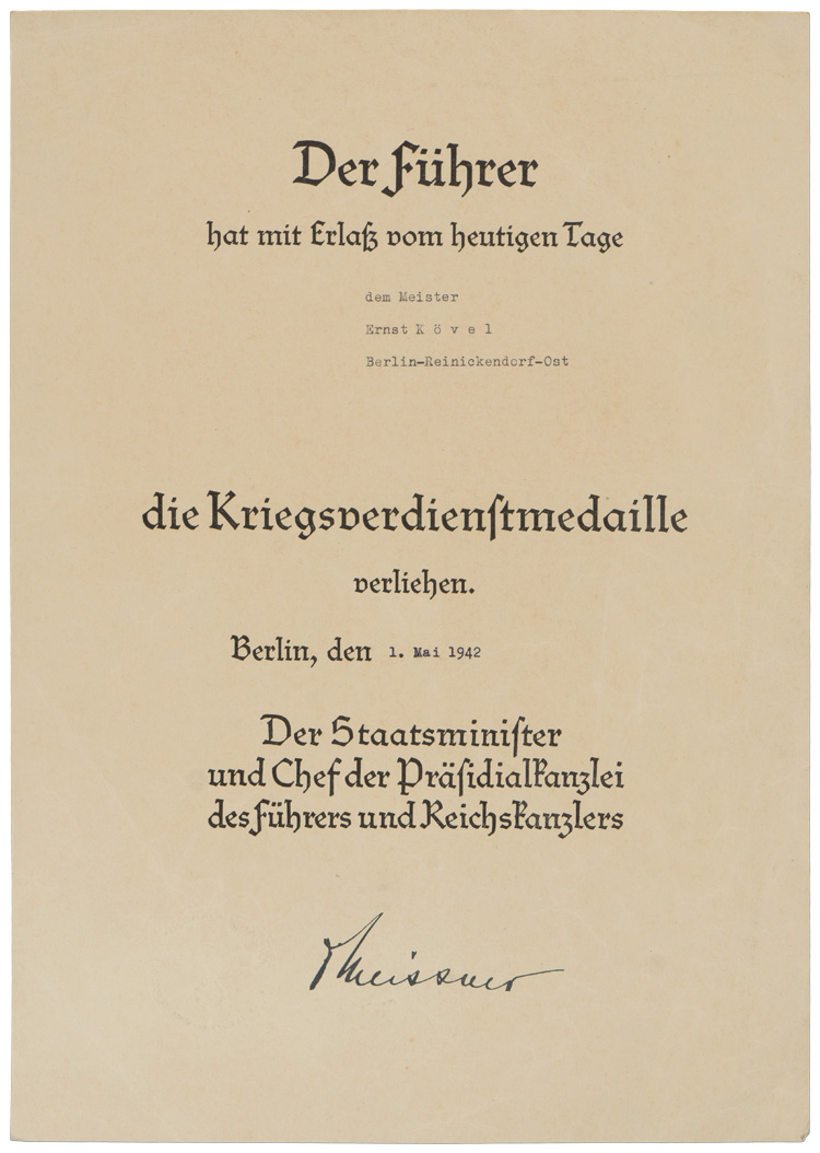BACKGROUND: The bestowal of all awards during the Third Reich was regulated by the Statutes of Titles, Orders and Decorations which was originally revised on January 30TH 1934, with numerous additional revisions as new awards and decorations were introduced. The regulations prescribed the criteria for bestowal and the specific form of wearing the award. Although the Statutes of Titles, Orders and Decorations held the ultimate decision in all matters of awards the Wehrmacht, (Armed Forces), was given control over the bestowal regulations of all military awards as long as they conformed to the appropriate statute. When bestowed the awards were usually accompanied by a "Vorläufiges Besitzzeugnis", (Preliminary Possession Certificate), followed by the official award presentation document. Depending on the specific award, bestowal authorization could be initiated by the commander of a divisional or smaller unit and the appropriate award information was entered into the recipients Soldbuch, (Pay Book), and his permanent Wehrstammbuch, (Military Service Book), which remained in the possession of the issuing recruitment authority. This example is an unissued document for bestowal of a War Merit Medal. The War Merit Medal was an extension of the War Merit Cross series of awards and was introduced on August 19TH 1940 for award to German nationals and foreign civilians who provided exceptional service to the war effort. Of Note: With the August 19TH 1940 expansion of the War Merit Cross series a Knight’s Cross of the War Merit Cross was also introduced for award to personnel who had provided a substantial contribution to the war effort.