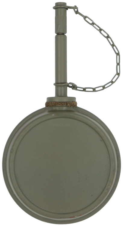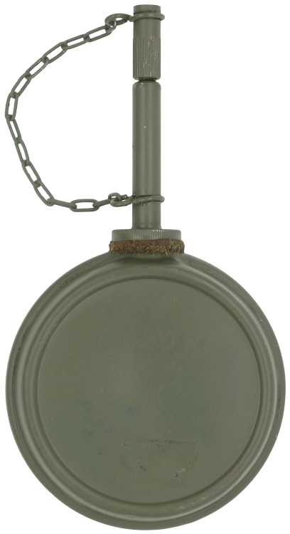 PHYSICAL DESCRIPTION: Field-grey painted, magnetic sheet metal construction MG34/42 oil can features a screw off top cap with a extended pour spout and a raised, brazed, beaded side seam. The screw off cap would be removed to fill the can while the extended spout would assist in getting to hard to reach spots on the weapon. The original screw cap leather washer is still intact. The extended spout also has a screw on cap that is secured to the can by a chain to prevent loss.