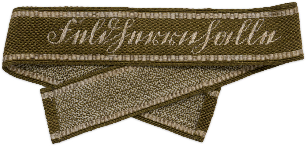 PHYSICAL DESCRIPTION: Roughly, 30mm tall, 48cm long, machine woven, tan rayon construction cufftitle with a repeating, interwoven, waffle pattern and machine, "BeVo", woven, Sütterlin style script "Feldherrnhalle" in silvery/grey celleon threads. The cufftitle is bordered at both the top and bottom edges in six strand, horizontally woven, silvery/grey celleon threads. Small snag to the material about 9cm away from the right end (see photo).The reverse of the cufftitle has loosely woven, vertical, silvery/grey celleon threads around the script and the script is in a tan rayon mirror image of the obverse.