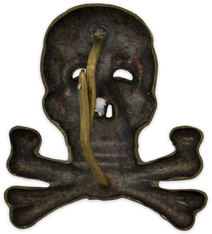 PHYSICAL DESCRIPTION: Roughly 30mm tall, 28mm wide, silver washed, die stamped alloy construction Officers pattern, Brunswick style skull and crossbones features a "face on", skull with two rows of teeth with the jaw bone resting on two, diagonally angled, crossed femur bones. The skull features embossed and recessed detailing, dual, horizontally oval, eye cut outs and dual, vertically oval nose cut outs. The reverse of the insignia is a mirror image of the obverse and has both of the original, soldered, attachment prongs is still intact. The insignia has no visible manufacturer’s markings. Scarce traditions cap badge.