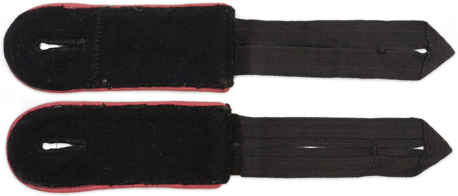 BACKGROUND: The use of collar ornamentation on military uniforms was utilized by numerous assorted nations with the main function being the indication of the wearer’s rank and/or branch of service. In November 1934 the Germans introduced the black Panzer wrap tunic for the newly formed armored units and it was worn through-out the war with minor modifications in 1936 and 1942. Along with the new black Panzer wrap tunic the Germans also introduced the unique Panzer collar tabs which utilized the old Prussian "Danziger" style skull and crossbones. The skulls and crossbones were worn through-out the war with minor manufacturing variations. The different branches of service within the German army were allocated a specific, identifying, waffenfarbe, (Branch of Service Color), with pink being chosen for Panzer, (Armored), personnel, which was generally displayed on the collar tabs. Of Note: The general waffenfarbe for all armored units was pink although other colors were utilized including red for armored artillery units, golden yellow for armored reconnaissance units and the 24TH Panzer Division, lemon yellow for armored signals units and, for a short time, alternating black and white for armored engineer units. Also Of Note: The "Danziger" style skull and crossbones were also worn on the field-grey Assault Artillery wrap tunic.