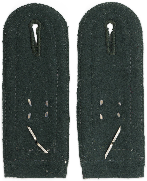 PHYSICAL DESCRIPTION: Early, (November 1938 May 1940), second pattern, blue/green badge cloth construction, sew on shoulder straps with a single rank pip to each along with bright silver/aluminum, diamond patterned, NCO’s tress to all the outside edges and white wool waffenfarbe piping. For the 93rd Infantry Regiment,