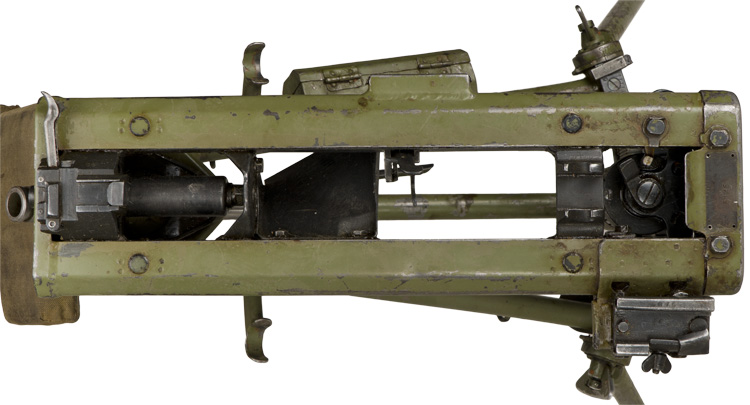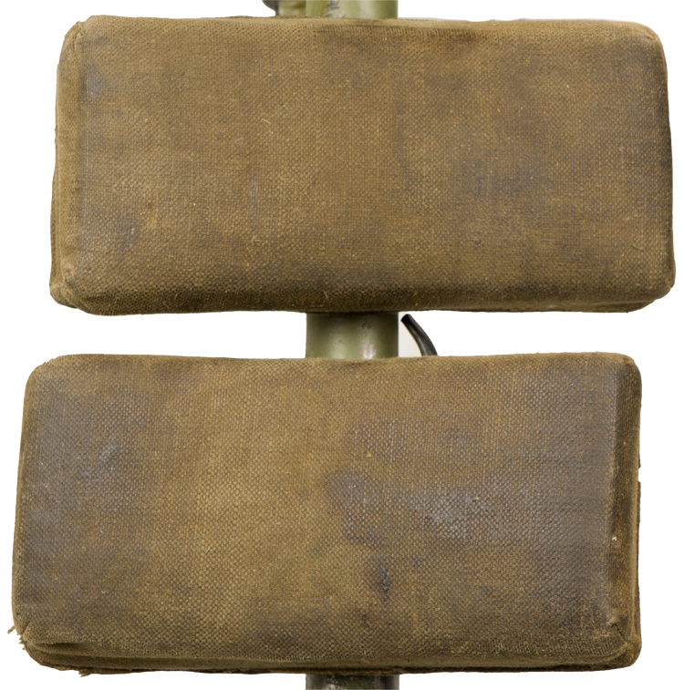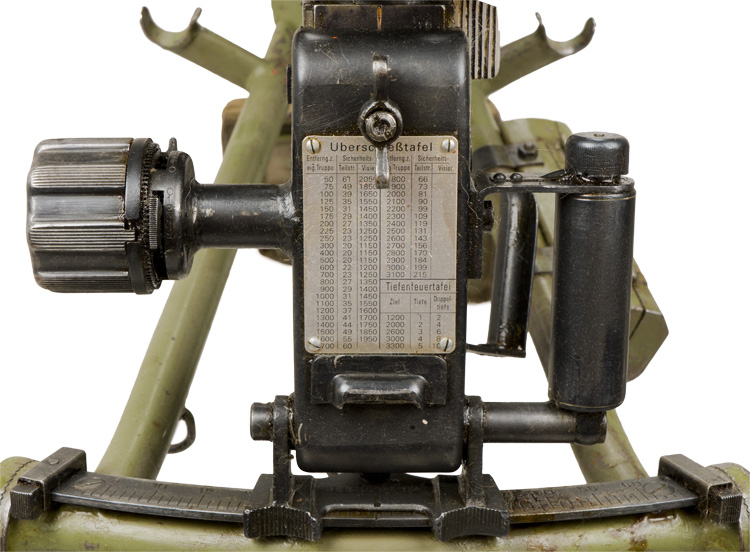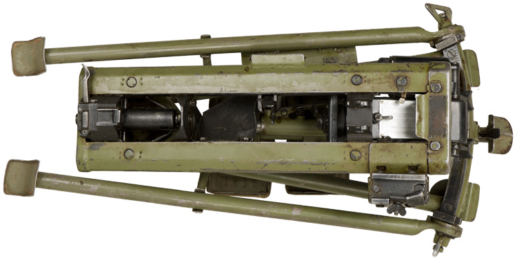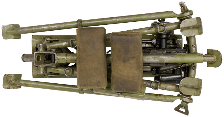 Similar to the MG34 Lafette but designed with modifications to adapted to the MG42. The MG42 was considered a heavy MG when used in conjunction with this stand. Tubular metal frame with sheet metal and machine tooled steel and aluminum parts. This particular example is made up of parts from several different original German wartime stands (Including MG34 stand parts). Pads and and bolt box are post war Yugoslavian. The uberschiess taffel is a reproduction that replaced the Yugoslavian example that would have been on this. Optics mount are damaged.