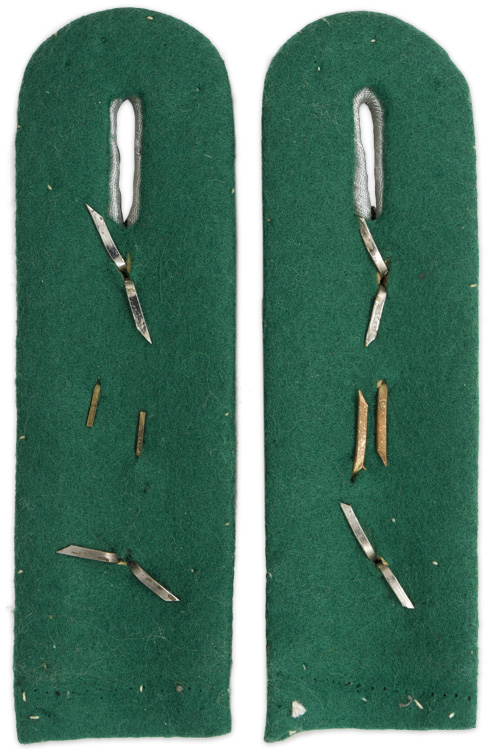 PHYSICAL DESCRIPTION: Sew on shoulder boards in matte silver/aluminum Russian braid with a fine twisted dark green cord stripe separating the two outer and inner braids, dual stamped alloy rank pips and an overlapping, stylized, natural stamped alloy, "HV", cypher indicating Heeres Verwaltung, (Army Administration), on a mid green wool waffenfarbe base with light grey wool nebenfarbe, (secondary color). The secondary color is sandwiched between the Russian braid and the mid green wool base and is just visible at the sides.