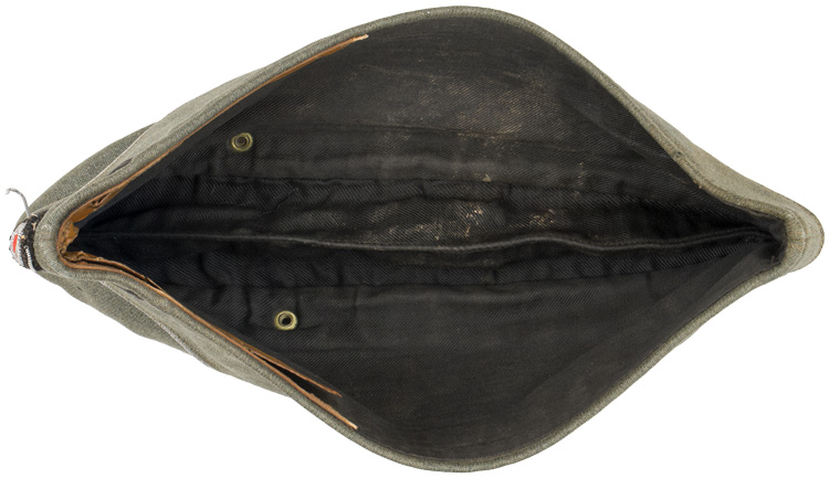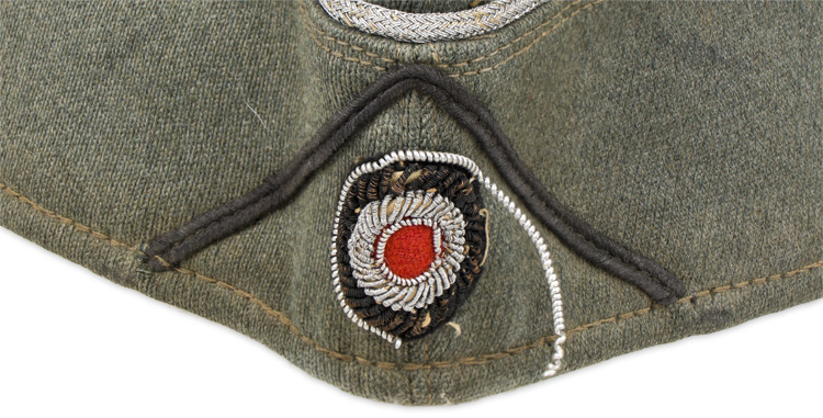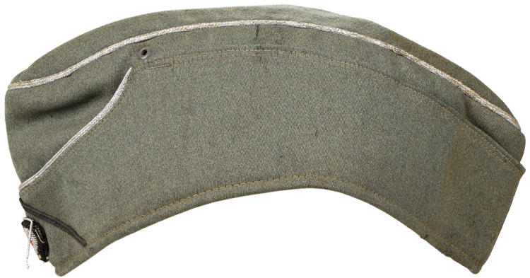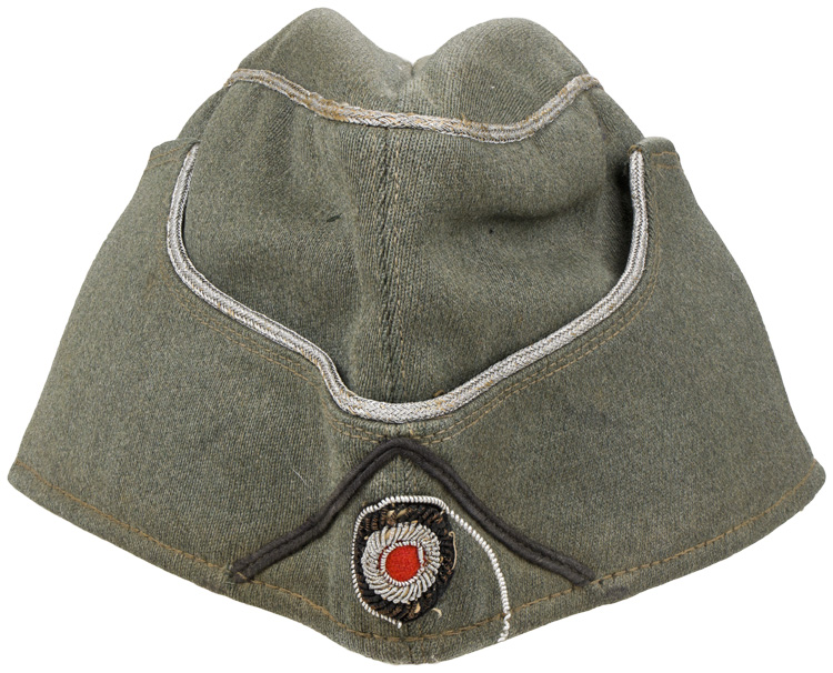 PHYSICAL DESCRIPTION: Nice quality, M38 pattern, field-grey wool and rayon blend construction cap with a subtly ribbed gaberdine weave. The cap features fold down side and back panels with scalloped slopes to the forward side panels. The crown edge and the forward scalloped side panels are both piped in bright, interwoven, silver/aluminum braiding. As is typical the fold down panels are stitched in the upright position at the front center of the cap. The cap has a field-grey, enamel painted, magnetic sheet metal ventilation grommet to each side positioned just below the crown edges. Eagle has been removed. The front center of the fold down panels has a padded, hand embroidered national tri-color cockade which is original handstitched to the cap. Silver wire on the cockade is starting to come loose. The cockade is flanked by a black silk waffenfarbe soutache in an inverted "V" pattern. The soutache is applied in the proper manner running through slashes at the seam near the caps bottom edge and handstitched in place. Of Note: Regulations of July 10TH 1942 abolished the use of the branch of service soutache and instructed it to be removed from the caps, although the directive was not strictly adhered to. The interior of the cap is fully lined in ribbed, black cotton/rayon twill and has a partial, tan leather sweatband positioned at the front forehead section. Small tear to the sweatband. Unmarked. Looks to be about a size 56. Nice untouched cap, just needs an eagle.