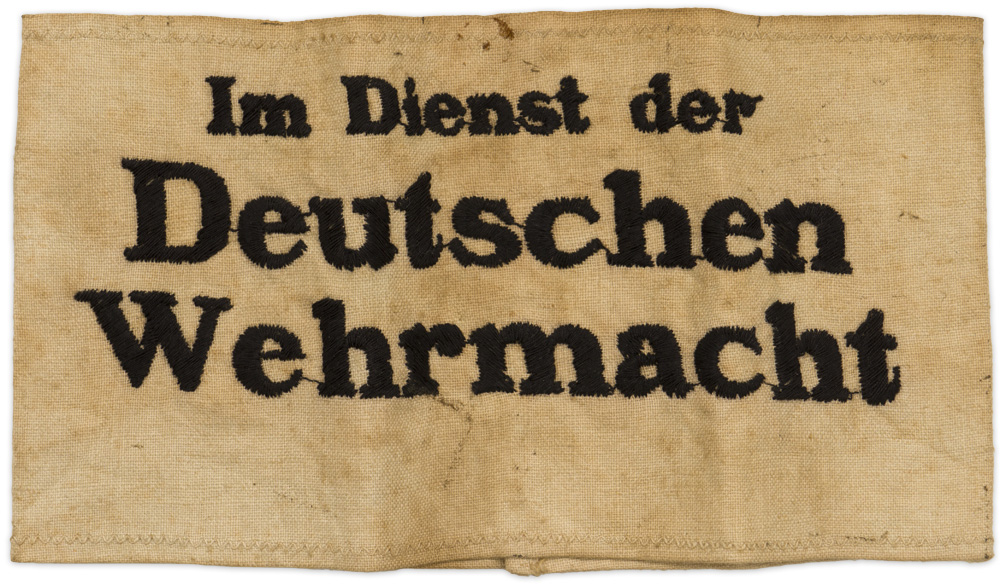 BACKGROUND: The Army Mobilization Order of March 12TH 1937, introduced a wide variety of armbands that were worn to identify personnel performing specific duties or functions for the Armed Forces. Most of the armbands were worn on the upper left sleeve of uniformed or non-uniformed personnel and were worn only while the individual was performing the specific duty or function identified by the armband. As the war progressed it was deemed that additional armbands were necessary to identify the growing sector of non-uniformed, non-German civilian personnel serving in a military capacity with any branch of the armed forces. As a result assorted identifying armbands were introduced as required. This armband was introduced on October 1ST 1941 for wear by non-German civilians serving the Armed Forces and Russian Auxiliaries when not in uniform.