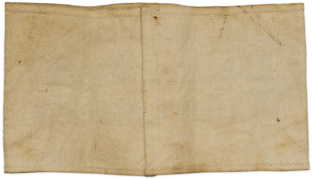 PHYSICAL DESCRIPTION: Roughly 40cm wide, 10.5cm tall, white cotton/rayon construction armband with black machine emboidered script to the obverse, "Im Dienst der Deutschen Wehrmacht". (In Service of the German Armed Forces). Reverse of armband has a machine stitched vertical seam. Rare varient.
