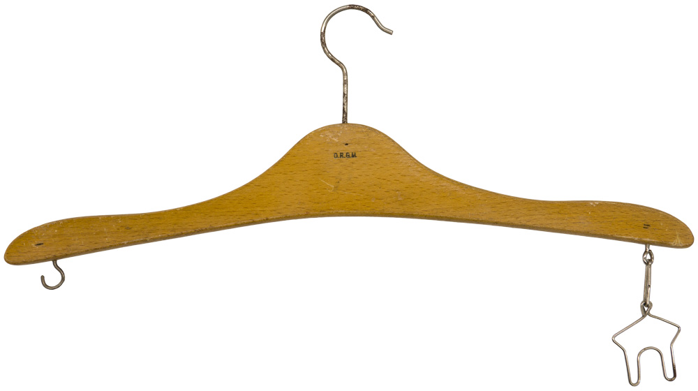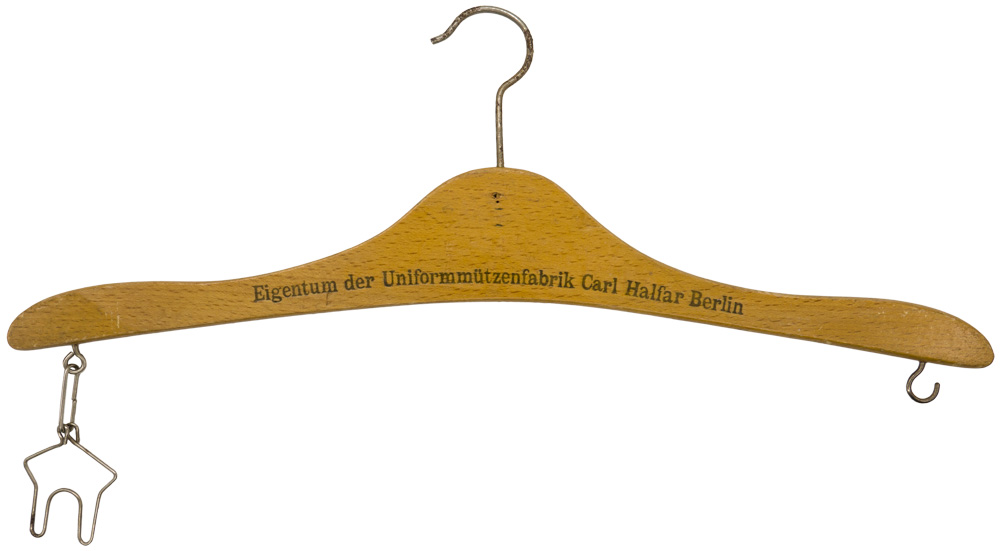 (Kleiderbügel)Original wood and metal coat hanger. Nicely marked "Eigentum der Uniformmützenfabrik Carl Halfar Berlin". Approximately 46cm x 18cm.