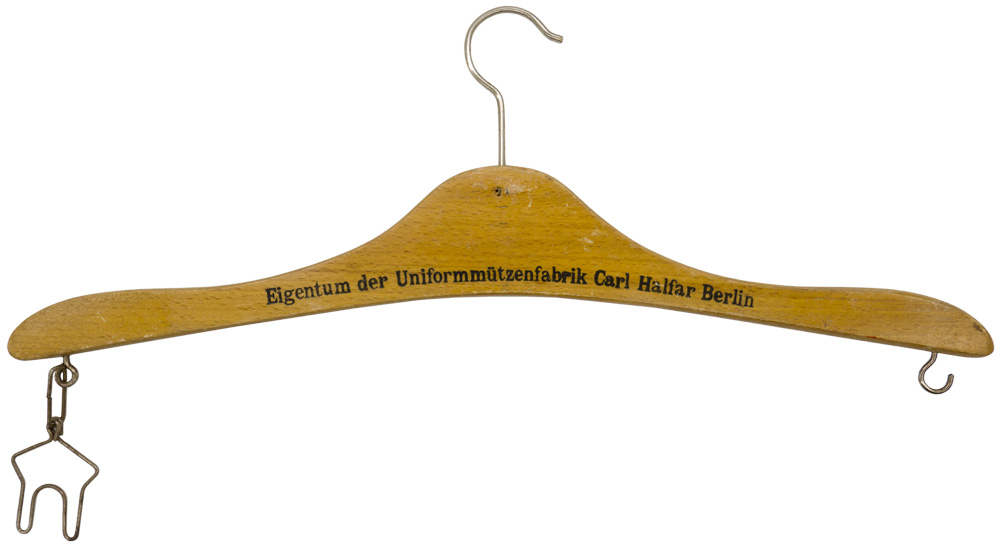 (Kleiderbügel)Original wood and metal coat hanger. Nicely marked "Eigentum der Uniformmützenfabrik Carl Halfar Berlin". Approximately 46cm x 18cm.