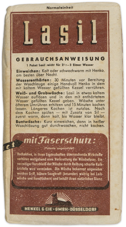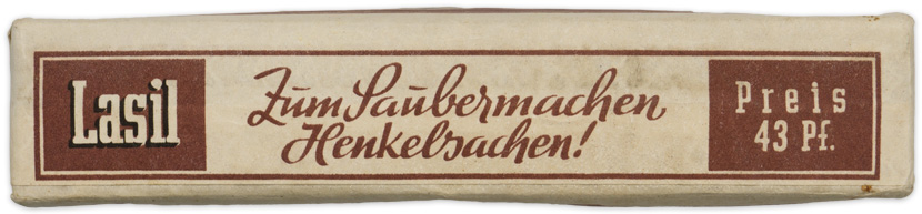PHYSICAL DESCRIPTION: A 9cm x 16cm x 3cm mid-weight paper package of laundry detergent with the manufacture name "Lasil" with printed instructions to the reverse. Very hard to date, but would make a nice addition to a display. The package shows light to moderate age toning but is fully intact.