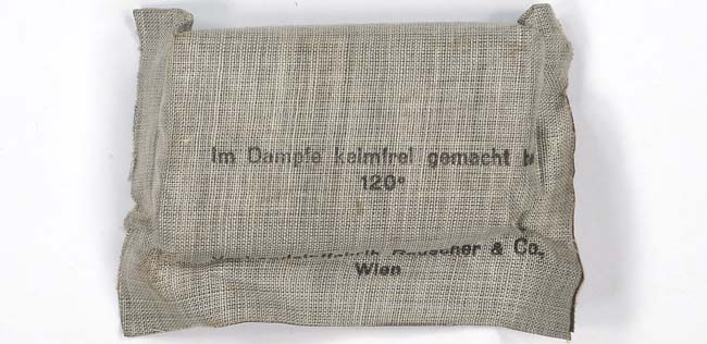 (Verbandpäckchen)BACKGROUND: Each Division in the German Army of WWII had Divisional Support units which included a medical unit that normally consisted of two companies, a mobile field hospital and two ambulance platoons. Within these medical units EM’s and Junior NCO’s with basic medical training acted as medical orderlies or stretcher bearers under the command of Doctors with Officers ranks. The German army also maintained static hospitals in the rear areas for those with more severe wounds and those with the most serious injuries that would require long rehabilitation times would be sent to a hospital in their home military recruiting district within Germany. Generally the German field units preferred to care for their own wounded as much as possible as a convalescents transferred to a rear area static military or home military district hospital could potentially be dispatched to a new unit on their recovery. As a result most of the Divisional medical support units maintained a generous supply of medical equipment and accessories to provide the most favorable "in-house" care as possible. Among the medical equipment and accessories were a wide variety of bandages, wound dressings and basic first-aid items. Each soldier was issued with a large and a small field dressing and given basic instruction on how to properly dress a wound. These field dressing were designed specifically to fit in the field dressing pocket situated in the bottom right front panel of the field blouse.