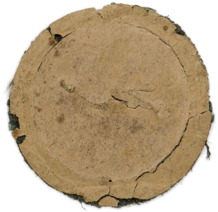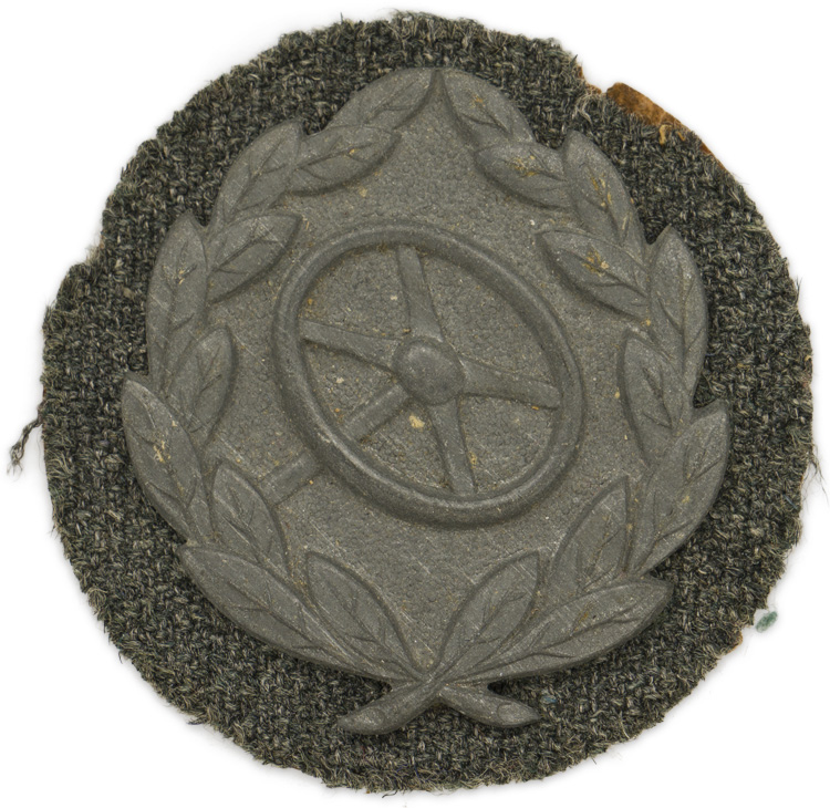 PHYSICAL DESCRIPTION: Stamped alloy badge with a silver wash. The badge is in the form of an embossed, circular laurel leaf wreath encompassing an embossed steering wheel on a pebbled background field. Badge green wool base with original backing plate and paper covering. The badge retains almost none of its original silver wash.