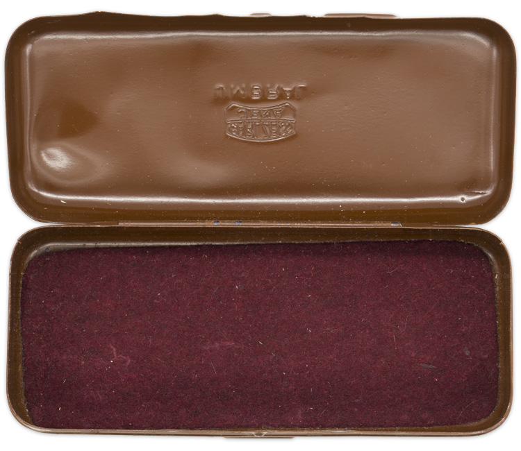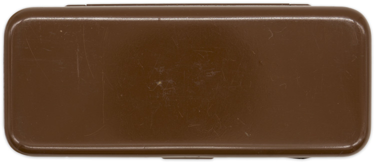 A brown painted, magnetic alloy, hinged case that measures approximately 3cm x 6cm x 14cm. The bottom of the case, to the interior is lined in a purple flocking.