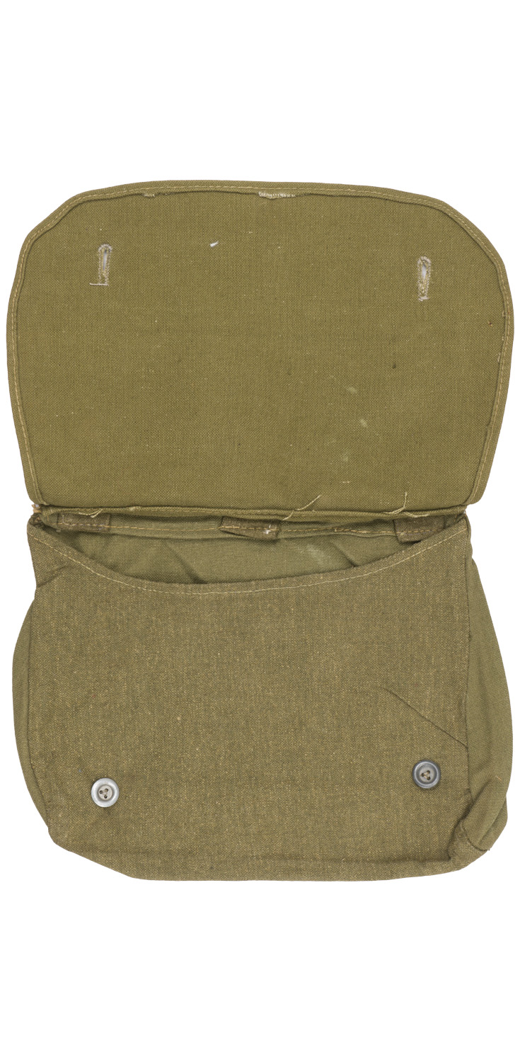 PHYSICAL DESCRIPTION: Olive drab, water repellent, canvas construction bread bag with leather, steel and alloy fittings. All buttons are present and the straps are complete. Typical late war example in nice clean condition.