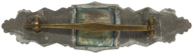 PHYSICAL DESCRIPTION: Die struck zinc construction clasp. The clasp features a central square panel with a recessed background field with an embossed national eagle with out-stretched wings, clutching a canted swastika in it’s talons, positioned above a crossed bayonet and grenade, flanked by four oak-leaves and dual acorns superimpose on a ribbed, horizontal outward, pointing base. The recessed, central, square panel has a blued, magnetic sheet metal, backing plate positioned behind the eagle, bayonet and grenade motif which is held in place by six small, crimped side dots on the reverse. The solid reverse has a solid, soldered, hinge, a broad, tapering, horizontal pin and catch. This is the "6 dot" examples produced by W. Hobacher. Scarce.