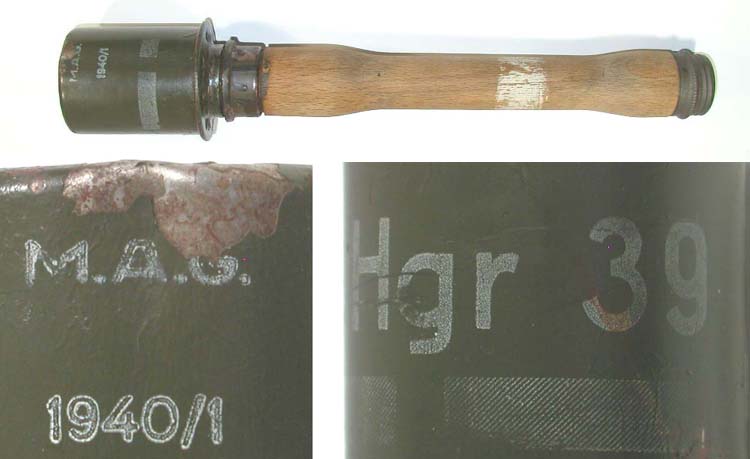 (Nebelhandgranate 39) M39 stick smoke grenade as developed in 1939 and based on the M24 pattern grenade. Smoke grenades were primarily used to conceal movement of friendly troops and obstruct observation by the enemy. Early pattern grenade consists of a sheet metal head and hollow lathed wooden handle. Grenade handle, head and screw capped bottom measure roughly, 14" tall inclusively. Field-grey painted sheet metal head has eight circular holes to the bottom edge for smoke to escape. Head retains about 90% of its original field-grey paint with small spots of wear to base metal and a small puncture hole to one side. Head is well marked with faint white stencilled designation, "Nb. Hgr 39", for Nebelhandgranate 39, (Smoke Hand grenade 39), and four horizontal white stripes with fine diagonal lines for ease of identification. Head also has white stencilled manufacturers initials, "M.A.G.", and date, "1940/1". Lathed, hollow cylindrical wooden handle with sheet metal fittings to top and bottom with additional screw on cap to bottom fitting. Handle has a stencilled white horizontal identification stripe near middle. Of Note: The white identification markings to head and handle were found to be inadequate at night and later patterns incorporated grooves in the handle for ease of recognition in the dark. Handle has faint illegible impressed makers mark and date that appears to "1940". Porcelain bead and pull cord both intact to handle interior.GRADE ***1/4 PRICE $390.00