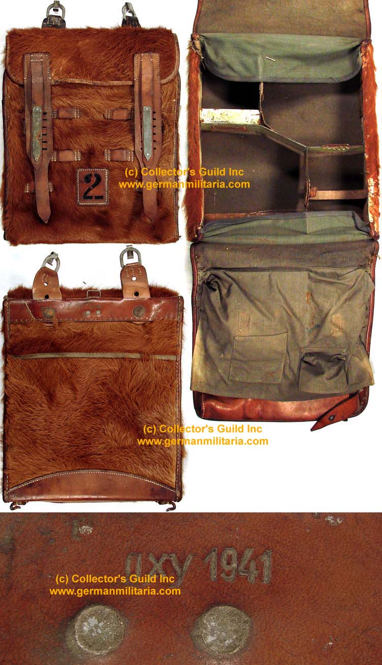 PHYSICAL DESCRIPTION: The pack measures 16" x 13" x 4", and has an internal wooden frame. Its exterior is covered in brown cowhide and is trimmed in tan leather. The top closure flap has two wide, tanned leather closure straps that taper to a narrower section. Each strap has six "slotted" cut outs that would be for connecting to a corresponding raised steel bar. The straps also have a stitched on auxiliary strap with a riveted flat steel bar that would then "slide" through the raised steel bar to secure the main straps. The front of the larger bottom flap has six vertical, stitched-on leather loops, and a layered patch of tan leather with the cut-out numeral "2" over a blackened leather underlay. The left side of the backpack has three, riveted on leather loops and the right side has one, riveted on leather loop. These were meant to carry additional equipment. The reverse, top edge of the backpack has a tanned leather strip stitched on with two non magnetic alloy rivets in the middle. The leather strip has two swivel-armed rivets that each secure a tanned leather carrying strap with a steel quick release hook. The leather strip is also clearly marked with the letters and date "gxy 1941" indicating manufacture by Gebrüder Klinge Lederwaren-Fabrik Dresden-Löbtau in 1941. The straps have three holes that are meant to be able to adjust the quick release hooks to whatever height was required. The bottom of the backpack has a tanned leather reinforcement strip stitched on and also a canvas strip to which is sewn on two leather reinforced quick release hooks. The reverse of the larger, lower flap, has one large canvas pocket with, two smaller pockets, and a tubular, stitched-in leather pocket with a studded snap closure. The canvas pocket would have had two leather straps attached to it, but these straps are missing. The interior is sectioned off into four separate sections, with rivetted in, sheet metal separators. One of the sections have rivetted in, leather retaining strap. The pack is in overall very good condition with minor chafe and wear. All of the leather is still quite supple.