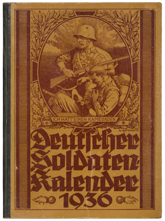 A 18.5cm x 25cm, stiff cover calendar that consists of 186 pages of various advertisements, articles, illustrations and black and white photographs. The pages show usage, wear and typical yellowing due to age. The front cover is reinforced with a clear tape.