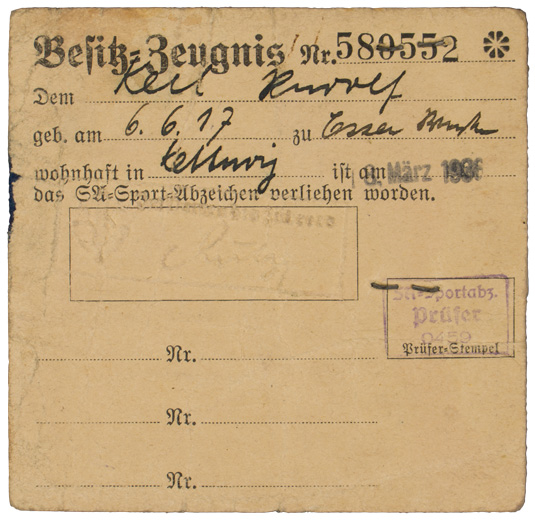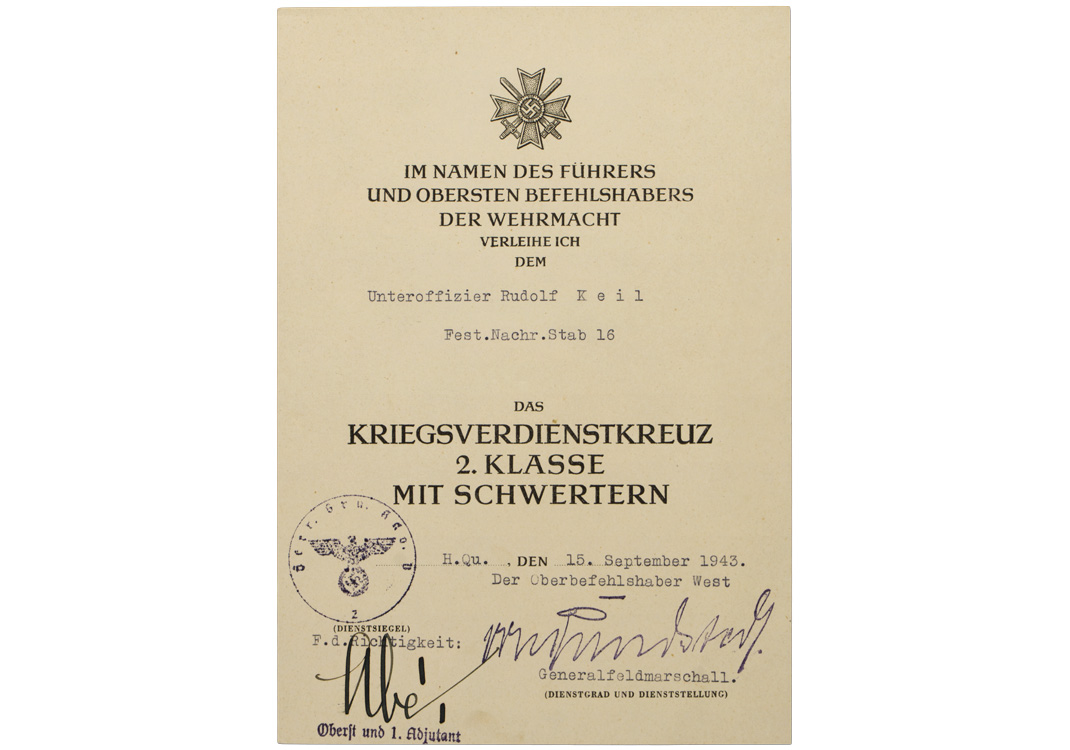 A grouping that belongs to Rudolf Keil that includes a "Besitzzeugnis" with a small black and white photograph of Rudolf Keil, a Reichssportabzeichen dated for 1941, also with a small black and white photograph who was awarded a bronze medal. The last document is the mid-weight paper document with black, printed Gothic/Fraktur script and typed in particulars. The script indicates that, "Unteroffizier Rudolf Keil, of "Fest. Nachr. Stab 16" was awarded the War Merit Cross, 2nd Class with Swords at Headquarters on "15. September 1943". It bears the appropriate facsimile signature and stamp. All the documents show varying degrees of wear, but remain a very nice grouping worthy of further research.