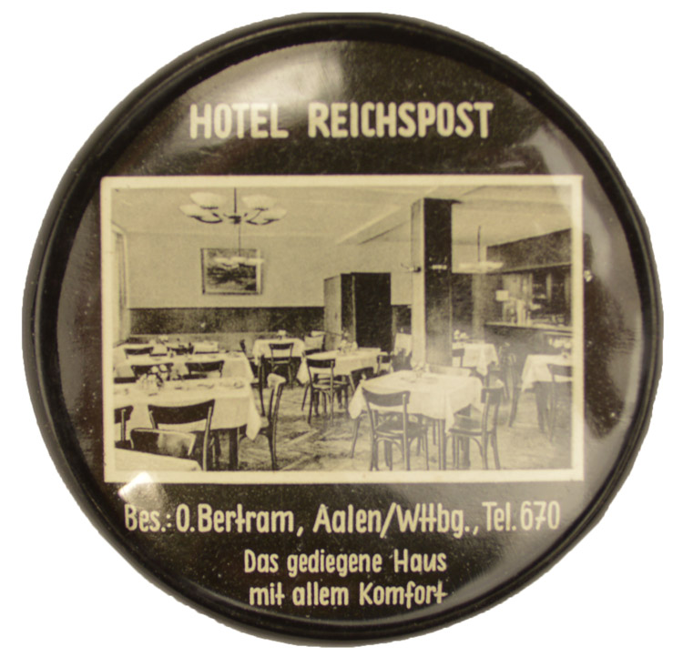 WW2 German soldier's pocket shaving mirror. Typical period advertising mirror, this one for the Hotel Reichspost (which obviously didn't exist after 1945). Nice example with no damage.