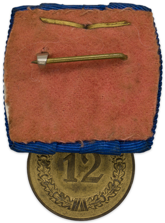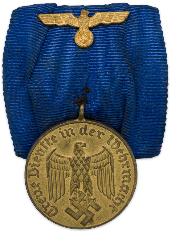 PHYSICAL DESCRIPTION: Gilt washed, die struck, magnetic, third class award for twelve years service. The award features an embossed Wehrmacht style eagle with down-swept wings encompassed by Gothic script, "Treue Dienste in der Wehrmacht" (Loyal Service in the Armed Forces), on a smooth background field to the obverse. The reverse has a large embossed numeral, "12" to the center encompassed by an embossed circular oak-leaf wreath also on a smooth background field. The ribbon suspension loop and ring are both intact. Original parade mount ribbon is present. Eagle cypher has both pins present.